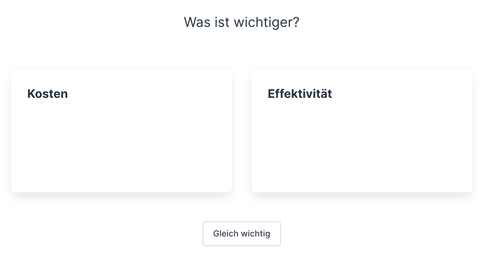 Vergleiche problemlos 10, 50, 100 oder 200 Optionen im Paarvergleich. Dank SMART Algorithmus ist die Durchführung auch mit 100 Optionen extrem schnell.